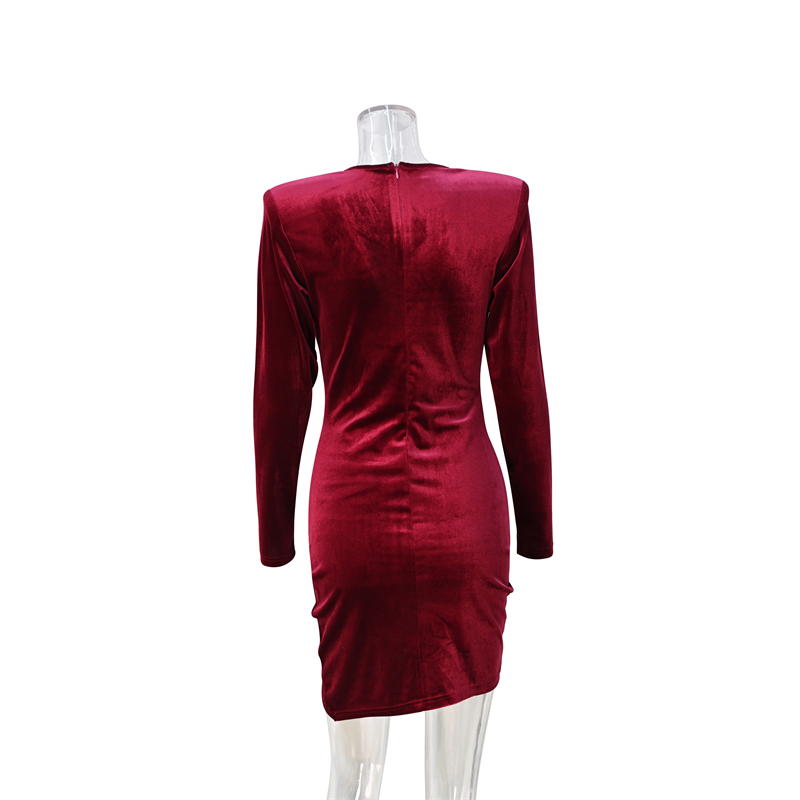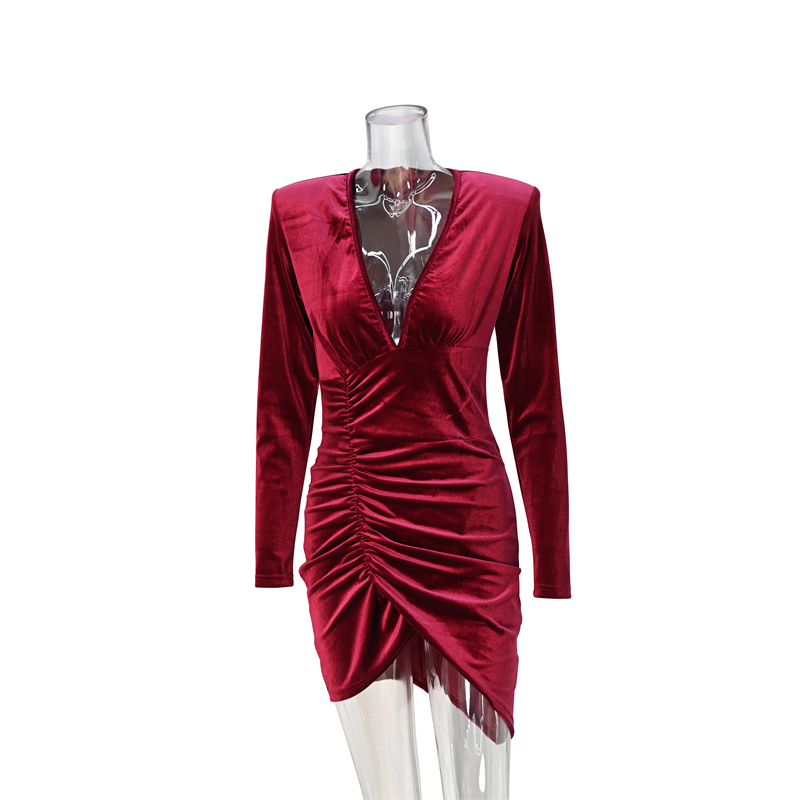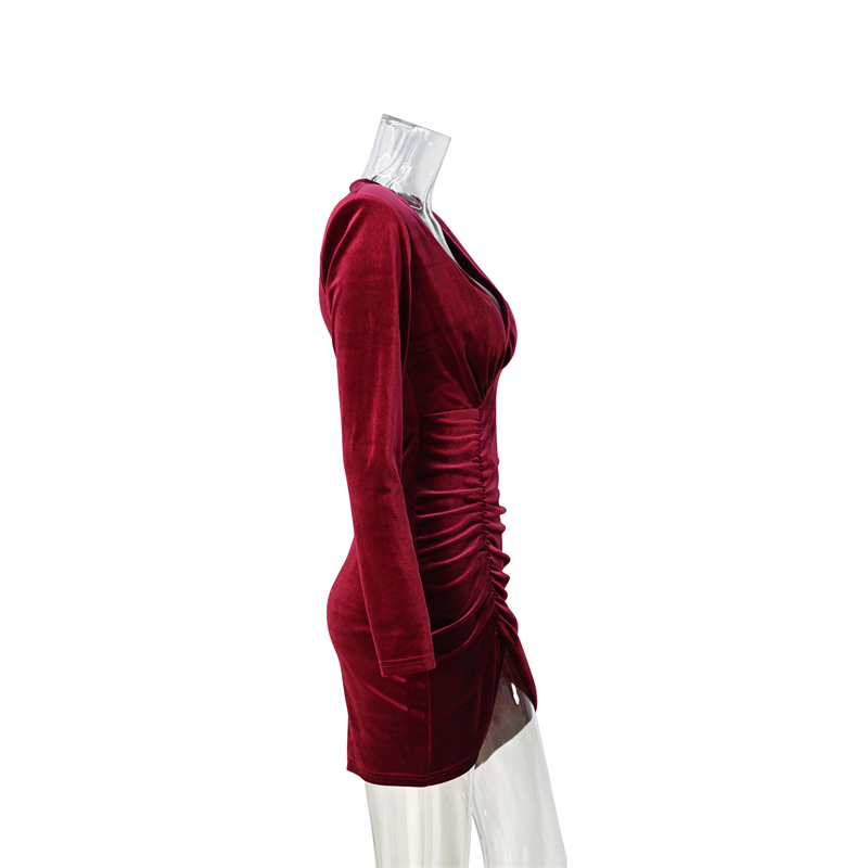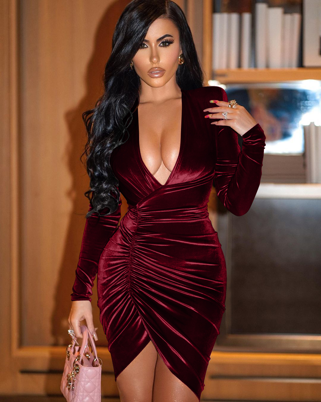 Womens Long Sleeve Elegant Ruched Casual Deep V Neck Sexy Party Club Velvet Dress Career Dresses Women