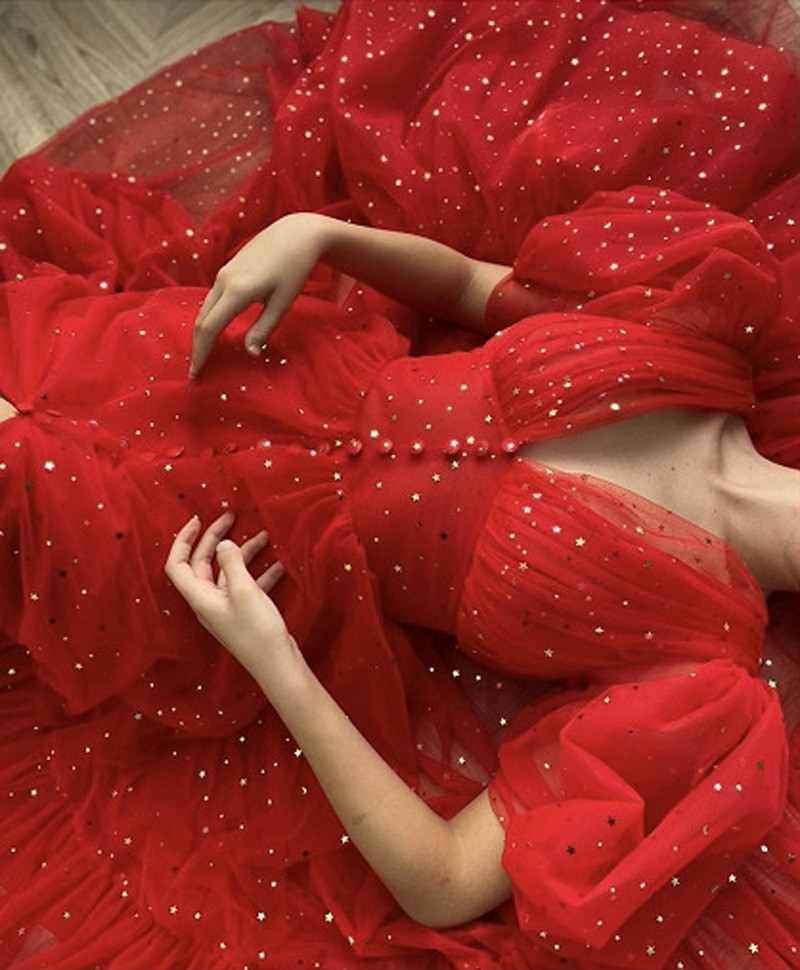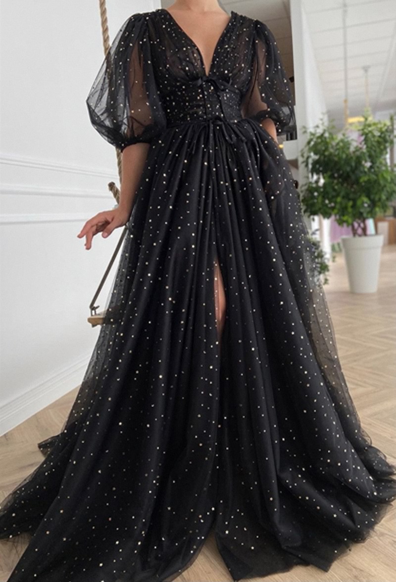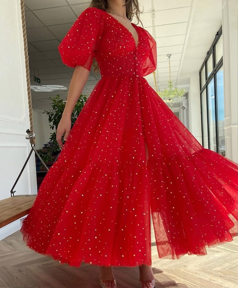 Modern Style Women Clothing V-Neck Lantern Sleeve Bright Mesh Women Evening Dress