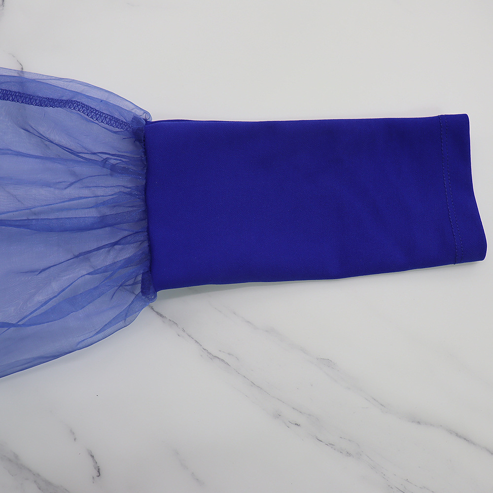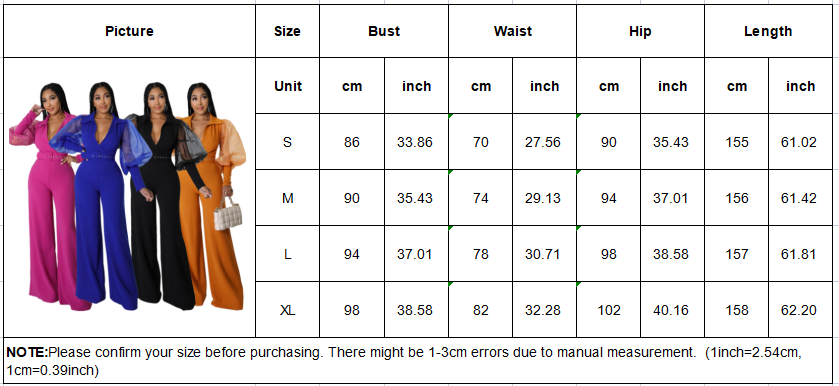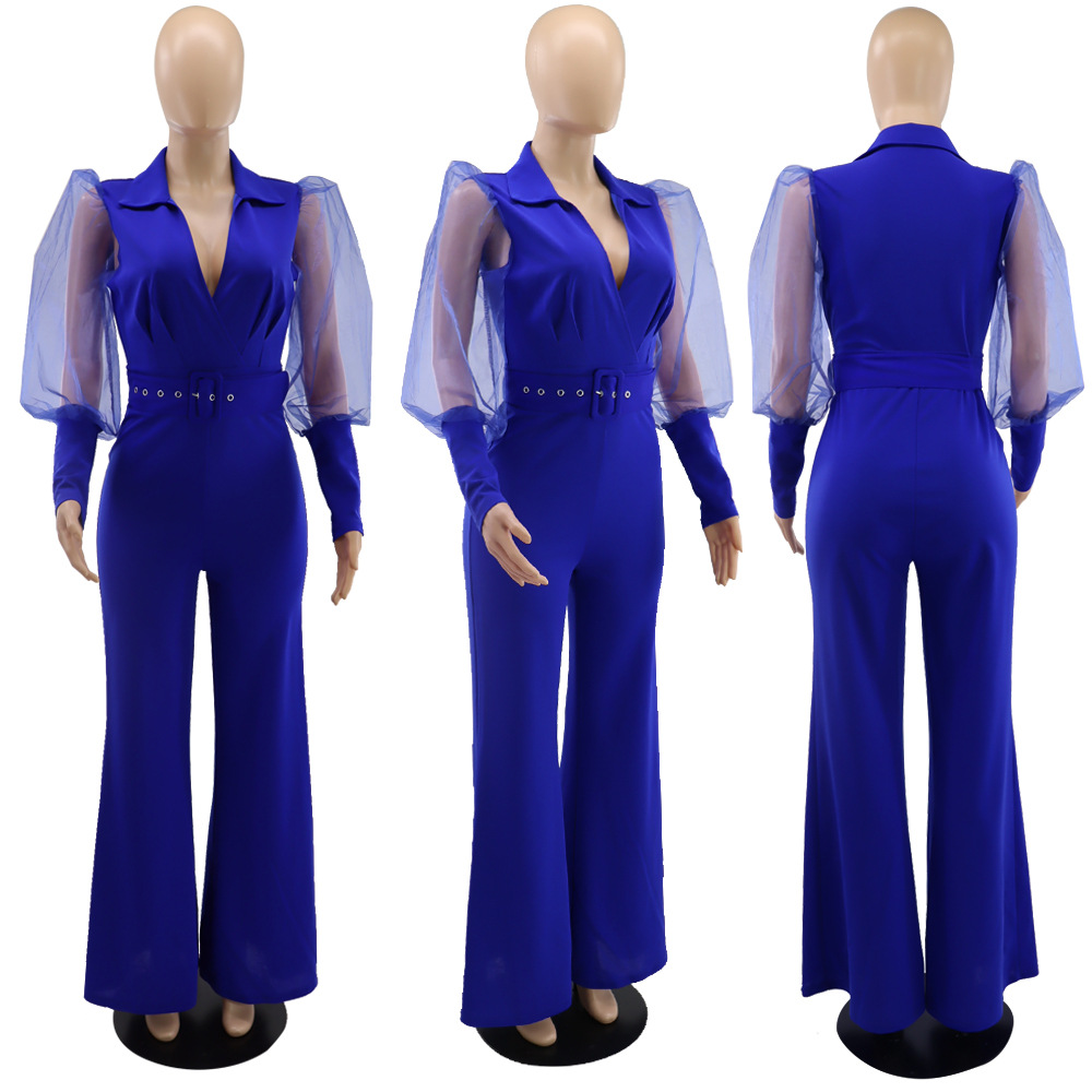 Europe and America Amazon V-Neck Mesh Puff Sleeve Women’s Loose Flared Jumpsuit With Belt